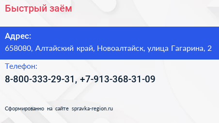 Быстрый заём по адресу 658080, Алтайский край, Новоалтайск, улица Гагарина, 2 в дальнейшем Организация, размещена в следующих категориях: