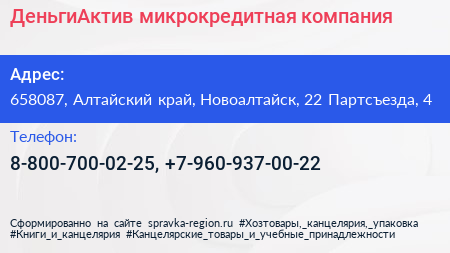ДеньгиАктив, микрокредитная компания по адресу 658087, Алтайский край, Новоалтайск, 22 Партсъезда, 4 в дальнейшем Организация, размещена в следующих категориях: