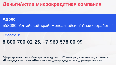 ДеньгиАктив, микрокредитная компания по адресу 658080, Алтайский край, Новоалтайск, 7-й микрорайон, 2 в дальнейшем Организация, размещена в следующих категориях: