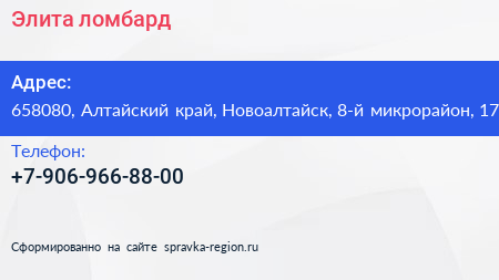 Элита, ломбард по адресу 658080, Алтайский край, Новоалтайск, 8-й микрорайон, 17 в дальнейшем Организация, размещена в следующих категориях: