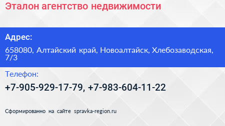 Эталон, агентство недвижимости по адресу 658080, Алтайский край, Новоалтайск, Хлебозаводская, 7/3 в дальнейшем Организация, размещена в следующих категориях: