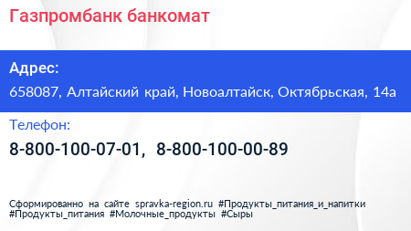 Газпромбанк, банкомат по адресу 658087, Алтайский край, Новоалтайск, Октябрьская, 14а в дальнейшем Организация, размещена в следующих категориях: