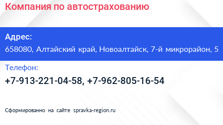 Компания по автострахованию по адресу 658080, Алтайский край, Новоалтайск, 7-й микрорайон, 5 в дальнейшем Организация, размещена в следующих категориях: