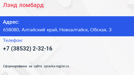 Лэнд, ломбард по адресу 658080, Алтайский край, Новоалтайск, Обская, 3 в дальнейшем Организация, размещена в следующих категориях: