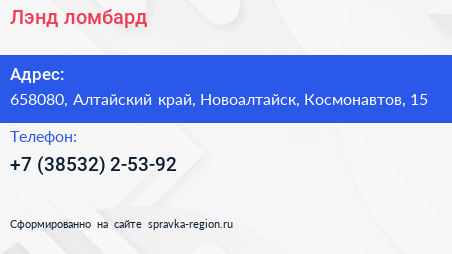 Лэнд, ломбард по адресу 658080, Алтайский край, Новоалтайск, Космонавтов, 15 в дальнейшем Организация, размещена в следующих категориях: