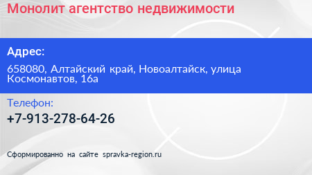 Монолит, агентство недвижимости по адресу 658080, Алтайский край, Новоалтайск, улица Космонавтов, 16а в дальнейшем Организация, размещена в следующих категориях: