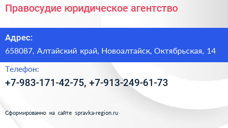 Правосудие, юридическое агентство по адресу 658087, Алтайский край, Новоалтайск, Октябрьская, 14 в дальнейшем Организация, размещена в следующих категориях: