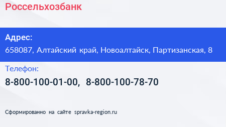 Россельхозбанк по адресу 658087, Алтайский край, Новоалтайск, Партизанская, 8 в дальнейшем Организация, размещена в следующих категориях: