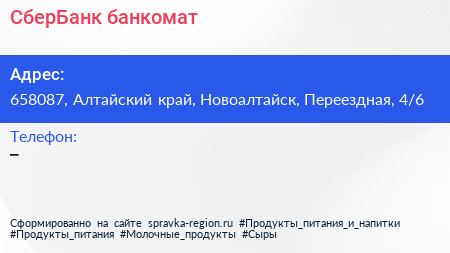 СберБанк, банкомат по адресу 658087, Алтайский край, Новоалтайск, Переездная, 4/6 в дальнейшем Организация, размещена в следующих категориях: