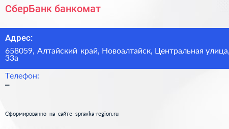 СберБанк, банкомат по адресу 658059, Алтайский край, Новоалтайск, Центральная улица, 33а в дальнейшем Организация, размещена в следующих категориях: