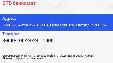 ВТБ, банкомат по адресу 658087, Алтайский край, Новоалтайск, Октябрьская, 24 в дальнейшем Организация, размещена в следующих категориях: