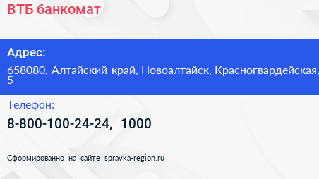 ВТБ, банкомат по адресу 658080, Алтайский край, Новоалтайск, Красногвардейская, 5 в дальнейшем Организация, размещена в следующих категориях: