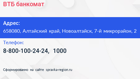 ВТБ, банкомат по адресу 658080, Алтайский край, Новоалтайск, 7-й микрорайон, 2 в дальнейшем Организация, размещена в следующих категориях: