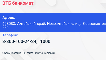 ВТБ, банкомат по адресу 658080, Алтайский край, Новоалтайск, улица Космонавтов, 22в в дальнейшем Организация, размещена в следующих категориях: