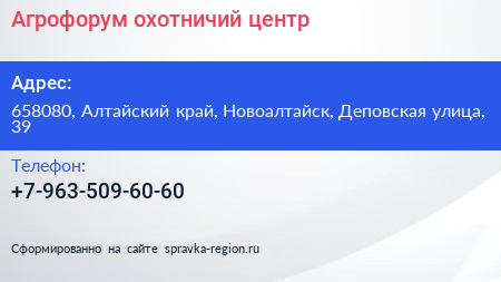 Агрофорум, охотничий центр по адресу 658080, Алтайский край, Новоалтайск, Деповская улица, 39 в дальнейшем Организация, размещена в следующих категориях: