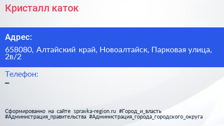 Кристалл, каток по адресу 658080, Алтайский край, Новоалтайск, Парковая улица, 2в/2 в дальнейшем Организация, размещена в следующих категориях: