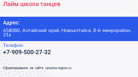 Лайм, школа танцев по адресу 658080, Алтайский край, Новоалтайск, 8-й микрорайон, 21а в дальнейшем Организация, размещена в следующих категориях: