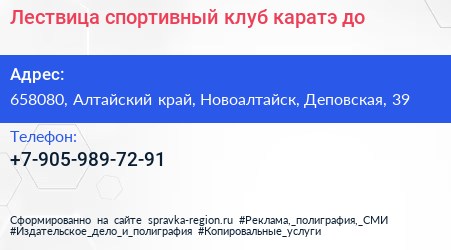 Лествица, спортивный клуб каратэ-до по адресу 658080, Алтайский край, Новоалтайск, Деповская, 39 в дальнейшем Организация, размещена в следующих категориях: