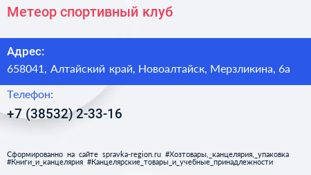 Метеор, спортивный клуб по адресу 658041, Алтайский край, Новоалтайск, Мерзликина, 6а в дальнейшем Организация, размещена в следующих категориях: