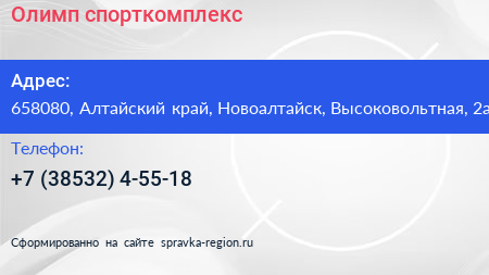 Олимп, спорткомплекс по адресу 658080, Алтайский край, Новоалтайск, Высоковольтная, 2а в дальнейшем Организация, размещена в следующих категориях: