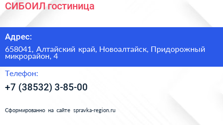 СИБОИЛ, гостиница по адресу 658041, Алтайский край, Новоалтайск, Придорожный микрорайон, 4 в дальнейшем Организация, размещена в следующих категориях: