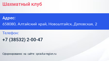 Шахматный клуб по адресу 658080, Алтайский край, Новоалтайск, Деповская, 2 в дальнейшем Организация, размещена в следующих категориях: