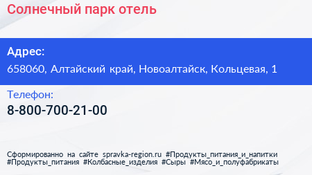 Солнечный, парк-отель по адресу 658060, Алтайский край, Новоалтайск, Кольцевая, 1 в дальнейшем Организация, размещена в следующих категориях: