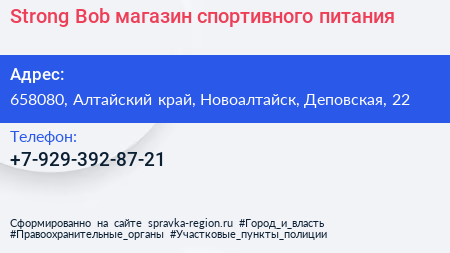 Strong Bob, магазин спортивного питания по адресу 658080, Алтайский край, Новоалтайск, Деповская, 22 в дальнейшем Организация, размещена в следующих категориях: