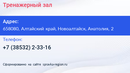 Тренажерный зал по адресу 658080, Алтайский край, Новоалтайск, Анатолия, 2 в дальнейшем Организация, размещена в следующих категориях: