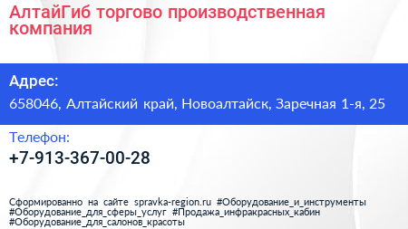 АлтайГиб, торгово-производственная компания по адресу 658046, Алтайский край, Новоалтайск, Заречная 1-я, 25 в дальнейшем Организация, размещена в следующих категориях: