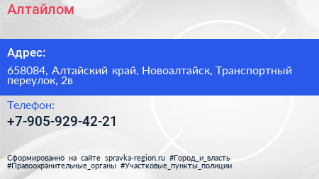 Алтайлом по адресу 658084, Алтайский край, Новоалтайск, Транспортный переулок, 2в в дальнейшем Организация, размещена в следующих категориях: