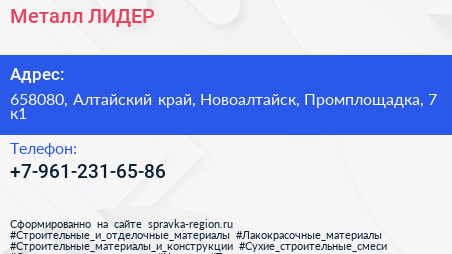 Металл ЛИДЕР по адресу 658080, Алтайский край, Новоалтайск, Промплощадка, 7 к1 в дальнейшем Организация, размещена в следующих категориях: