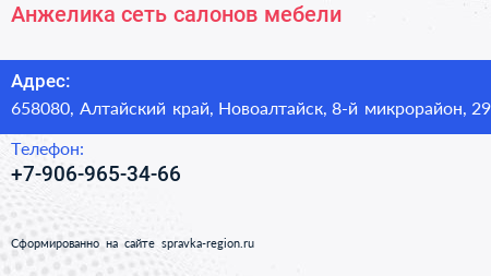Анжелика, сеть салонов мебели по адресу 658080, Алтайский край, Новоалтайск, 8-й микрорайон, 29 в дальнейшем Организация, размещена в следующих категориях: