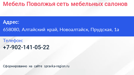 Мебель Поволжья, сеть мебельных салонов по адресу 658080, Алтайский край, Новоалтайск, Прудская, 1а в дальнейшем Организация, размещена в следующих категориях: