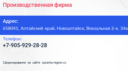 Производственная фирма по адресу 658041, Алтайский край, Новоалтайск, Вокзальная 2-я, 34а в дальнейшем Организация, размещена в следующих категориях:
