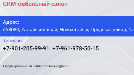 СКМ, мебельный салон по адресу 658080, Алтайский край, Новоалтайск, Прудская улица, 1а в дальнейшем Организация, размещена в следующих категориях: