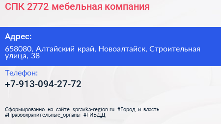 СПК 2772, мебельная компания по адресу 658080, Алтайский край, Новоалтайск, Строительная улица, 38 в дальнейшем Организация, размещена в следующих категориях: