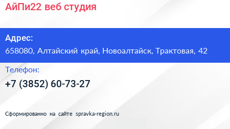 АйПи22, веб-студия по адресу 658080, Алтайский край, Новоалтайск, Трактовая, 42 в дальнейшем Организация, размещена в следующих категориях: