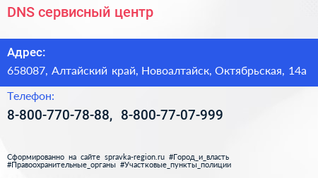 DNS, сервисный центр по адресу 658087, Алтайский край, Новоалтайск, Октябрьская, 14а в дальнейшем Организация, размещена в следующих категориях: