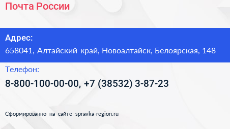Почта России по адресу 658041, Алтайский край, Новоалтайск, Белоярская, 148 в дальнейшем Организация, размещена в следующих категориях: