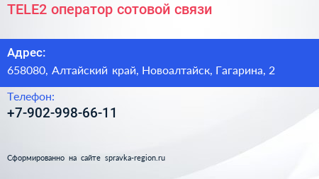 TELE2, оператор сотовой связи по адресу 658080, Алтайский край, Новоалтайск, Гагарина, 2 в дальнейшем Организация, размещена в следующих категориях: