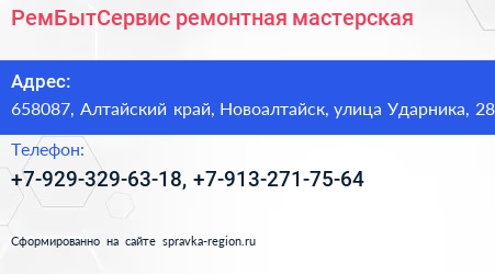 РемБытСервис, ремонтная мастерская по адресу 658087, Алтайский край, Новоалтайск, улица Ударника, 28 в дальнейшем Организация, размещена в следующих категориях: