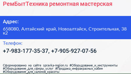 РемБытТехника, ремонтная мастерская по адресу 658080, Алтайский край, Новоалтайск, Строительная, 38 к2 в дальнейшем Организация, размещена в следующих категориях: