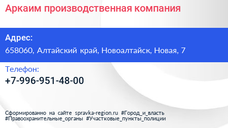 Аркаим, производственная компания по адресу 658060, Алтайский край, Новоалтайск, Новая, 7 в дальнейшем Организация, размещена в следующих категориях: