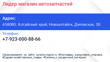Лидер, магазин автозапчастей по адресу 658080, Алтайский край, Новоалтайск, Деповская, 30 в дальнейшем Организация, размещена в следующих категориях: