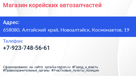 Магазин корейских автозапчастей по адресу 658080, Алтайский край, Новоалтайск, Космонавтов, 19 в дальнейшем Организация, размещена в следующих категориях: