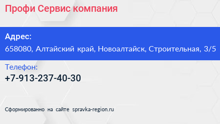Профи-Сервис, компания по адресу 658080, Алтайский край, Новоалтайск, Строительная, 3/5 в дальнейшем Организация, размещена в следующих категориях: