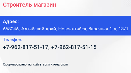 Строитель, магазин по адресу 658046, Алтайский край, Новоалтайск, Заречная 1-я, 13/1 в дальнейшем Организация, размещена в следующих категориях: