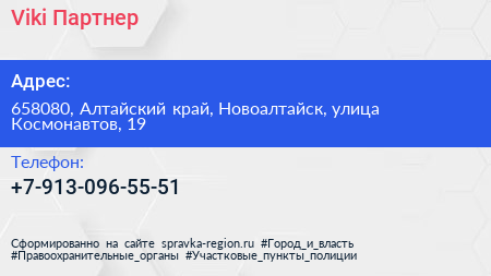 Viki-Партнер по адресу 658080, Алтайский край, Новоалтайск, улица Космонавтов, 19 в дальнейшем Организация, размещена в следующих категориях: