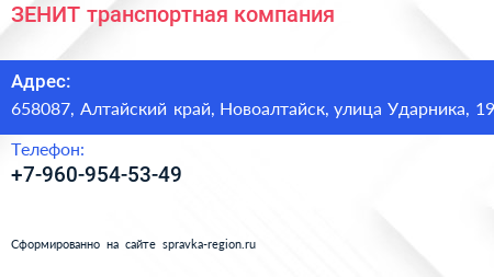 ЗЕНИТ, транспортная компания по адресу 658087, Алтайский край, Новоалтайск, улица Ударника, 19 в дальнейшем Организация, размещена в следующих категориях: